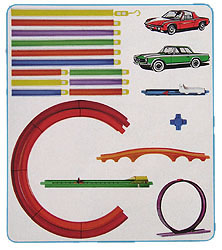 Inhalt: 6 Fahrbahnen (50 cm) / 6 Fahrbahnen (25 cm) / 1 grünes Katapult / 1 Looping / 1 Brücke / 1 Kreuzung / 1 Durchfahrtbeschleuniger / 12 Kurven / 2 Autos (hier: Mercedes 280 SL und VW-Porsche 914/6)